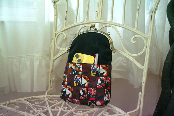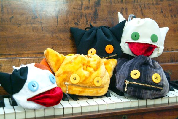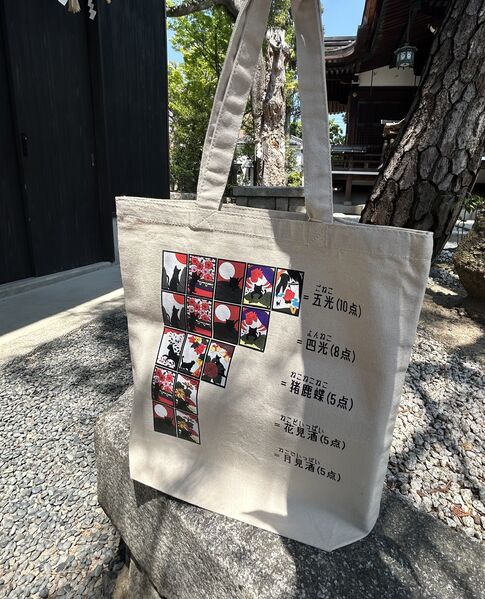 花札のような猫札をデザインしたアクセサリーや雑貨と、着物生地を使用した化け猫きんちゃく。