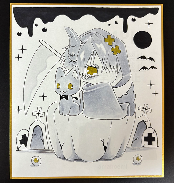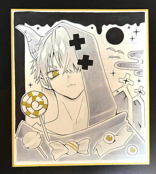 少し暗めなモチーフが好きで、死神、アンドロイド、双子、眼帯、目玉などをよく描いています。デジタルイラストメインですが、アナログイラストも描いています。