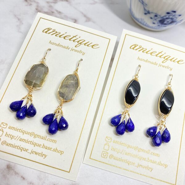 ラピスラズリとラブラドライト、オニキスの耳飾り