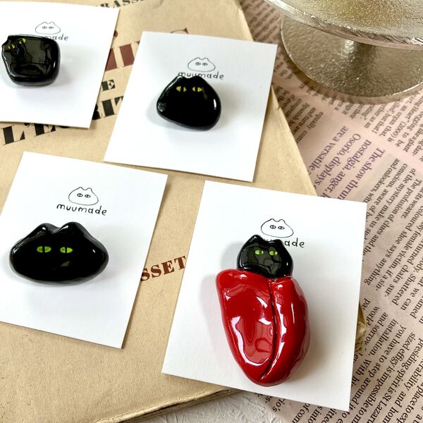 石塑粘土のマグネットやブローチ、刺繍アクセサリー、イラスト雑貨、ステッカーなど ぜひぜひ多種多様なあやしいねこたちを愛でにいらしてください♡