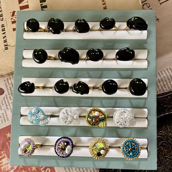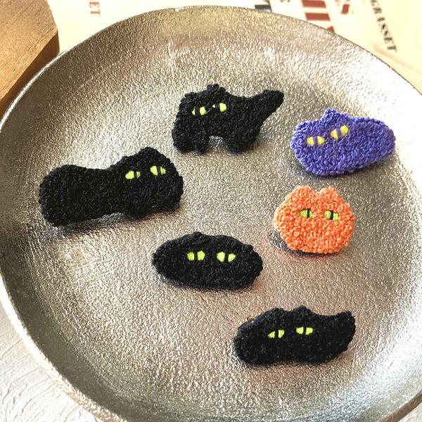 石塑粘土のマグネットやブローチ、刺繍アクセサリー、イラスト雑貨、ステッカーなど ぜひぜひ多種多様なあやしいねこたちを愛でにいらしてください♡