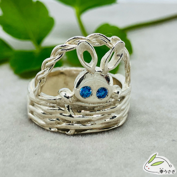 籠の中からこんにちは、籠入りうさぎのリング_光沢仕上げ(925,ジルコニア-ブルーカラー/11号)
