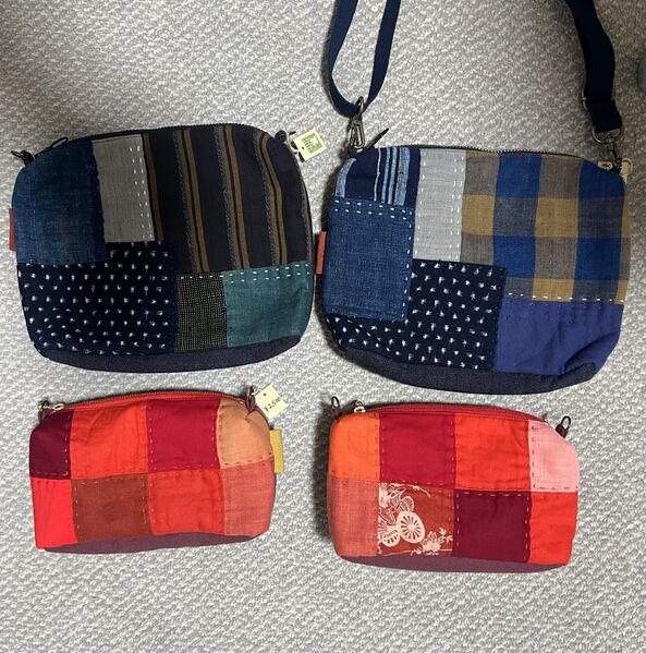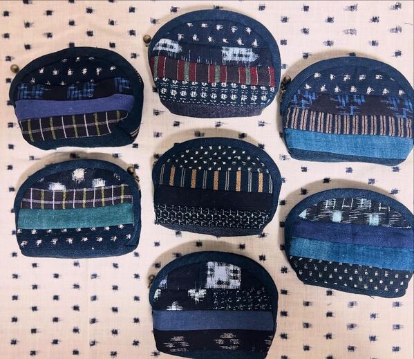 絣や藍染の木綿地 草木染や先染の布を合わせ バックやポーチなど 布小物を出品します。 全て一点ものです。