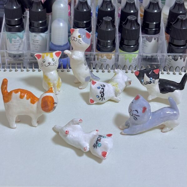 粘土やレジンを主に使った、猫オブジェ(人形)・猫モチーフアクセサリー、猫イラストカードやクリアファイルなど予定。