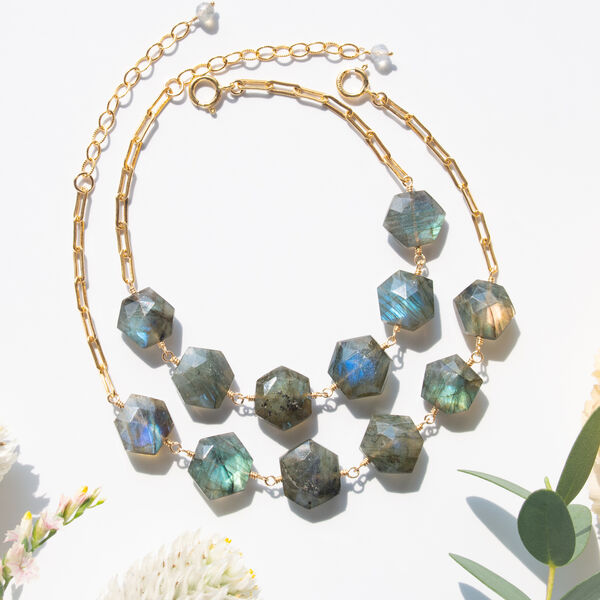 ラブラドライト(ヘキサゴンカット)とレクタングルチェーンのブレスレット(14KGF)