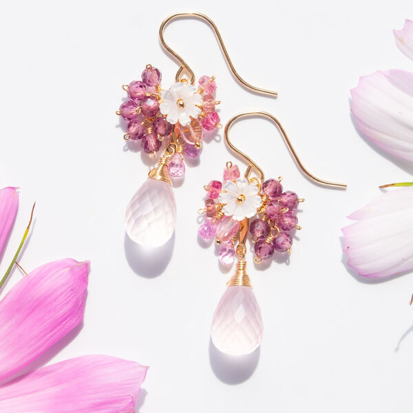 秋桜*ローズクォーツとシェルフラワー・天然石(ピンクサファイア・トルマリン)の彩りピアス(14KGF)/イヤリング