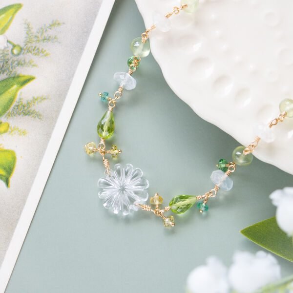 マーガレット*クリスタル(フラワー)と天然石(ペリドット・プレナイト・ムーンストーン)のブレスレット(14KGF)