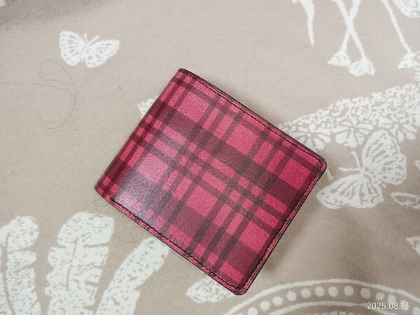 本革 チェック 赤&ブラウン 二つ折り財布