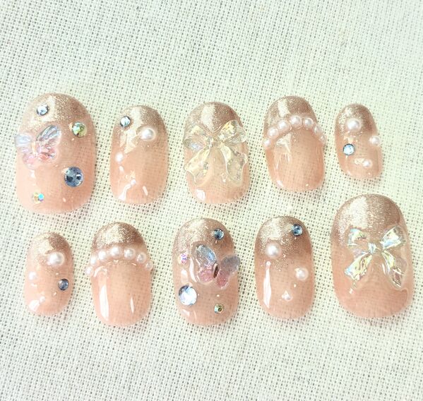 リボンと蝶々が可愛いキラキラフレンチネイル