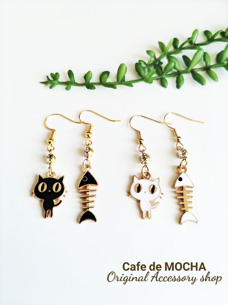 黒ねこ・白ねこと骨ピアス/イヤリング