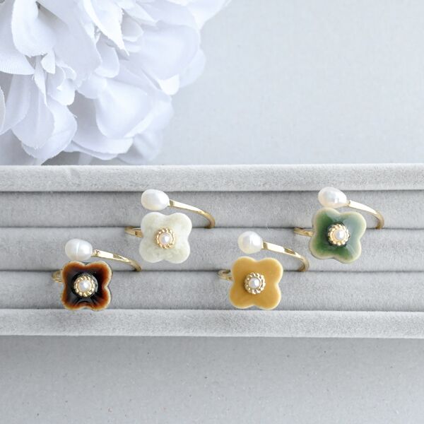 美濃焼タイルと淡水パールのリング