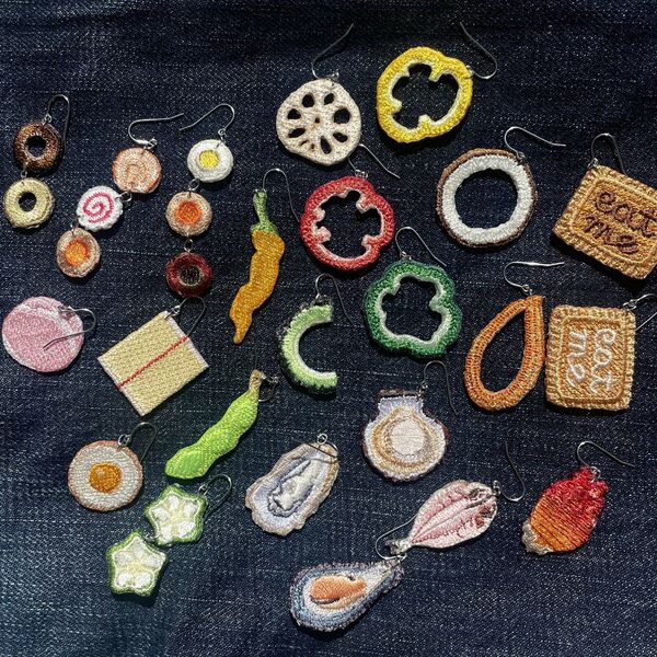 「おいしい」をテーマにした刺しゅうワッペンを作り続けている「おいしいせかい」です。みんなのおいしい記憶がよみがえって、お腹がすいちゃうような、一緒に食べた人や作ってくれた人を思い出しちゃうような、そんなものになれたらうれしいです。おいしい刺しゅうのワッペンやお寿司のポーチ「寿司ポ」、刺しゅうでできたおいしいピアスを見にきてください!