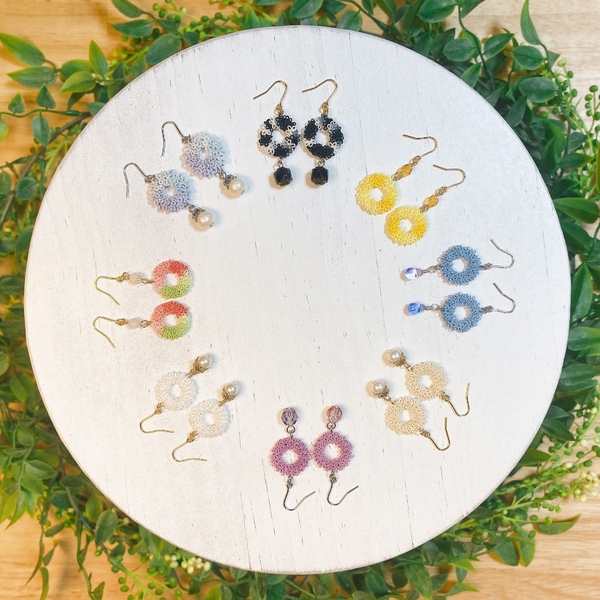 糸では鍵編みとタティングレースでアクセサリーを作り最近ではレース糸で編んだ指輪もございます。