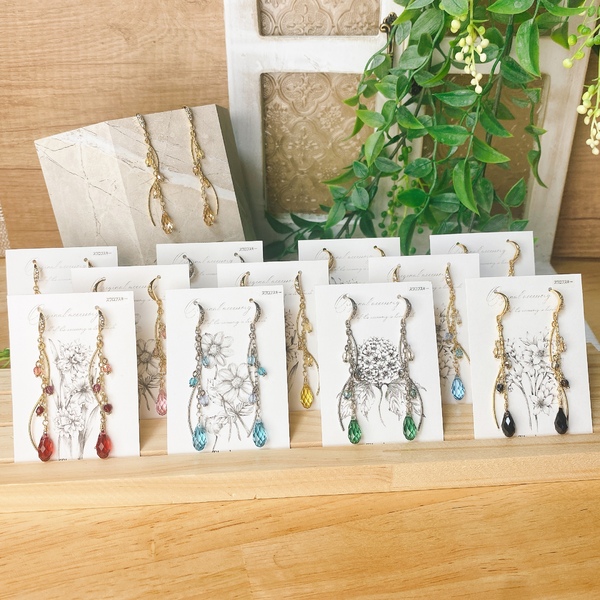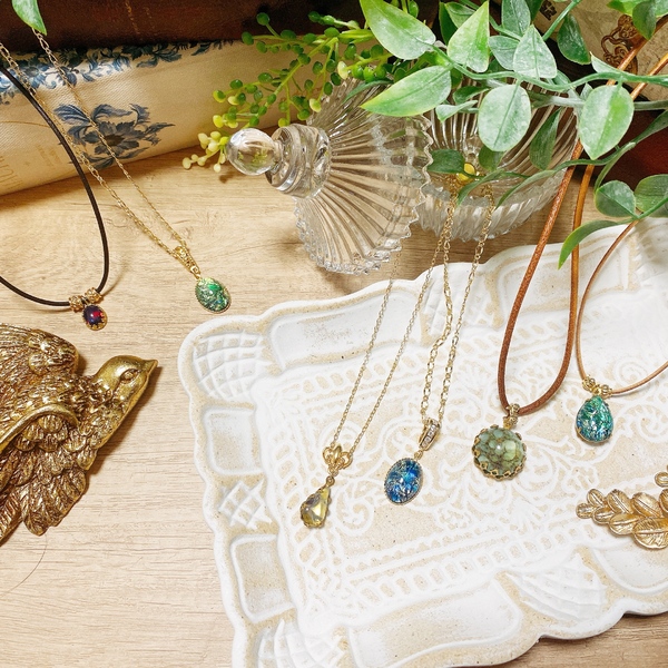 ガラスではヴィンテージも取り扱いつつ現代スワロやチェコビーズで色々なカラーを扱ってます。