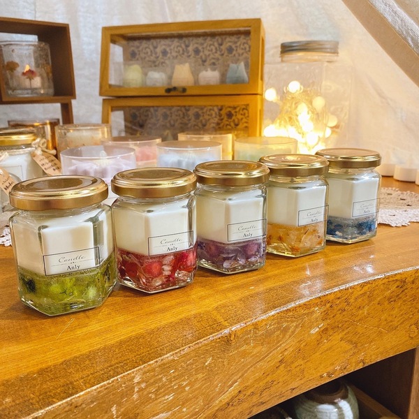 また、色から香りを連想できるようにこだわった香料を使用したキャンドルの販売やドライフラワーを使った珍しいキャンドルもございます。