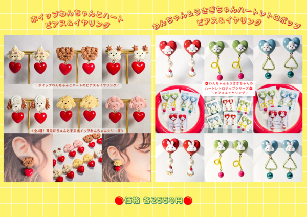 ホイップわんちゃんとハートピアス&イヤリング/わんちゃん&うさちゃんのハートレトロポップピアス&イヤリング