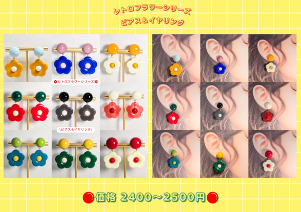 yotataの作品人気No.1の「レトロフラワーシリーズのピアス&イヤリング」も全種ご用意してお待ちしております!!こちらはInstagramでも全種カラーが公開されていますので是非ご覧ください!