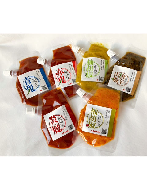 横浜産の青唐辛子と千葉産のブートジョロキア、神奈川や高知産の柚子を原材料に自宅の工房で製造。和・洋・中どんなお料理にも、またどんなお酒にもあうよう6種類の辛さのバリエーションをご用意いています。特徴としましては、トマトペーストをベースにオイスターソースやアンチョビ、粉チーズ、ガーリックで創り出した旨味に、青唐辛子で辛味をつけた「笑う青鬼」。ブートジョロキアで辛味をつけた「狼狽の炎魔」。青唐辛子とブートジョロキアのハーフで辛味をつけた「笑う赤鬼」。柚胡椒は青唐辛子で作る「萌黄の柚胡椒」と「青天の柚胡椒」。市販のビンの柚胡椒の4分の1の塩分です。そして青唐辛子と山椒で炊き込んだ佃煮「目醒めの唐辛山椒」はご飯のお供に欠かせません。すべてご試食いただけますので、きっとお気に入りの辛さをご実感いただけることでしょう。多くの激辛マニアさんはじめ、お酒好きな方にもご好評の商品をぜひ、おたのしみいただけましたらうれしいです。