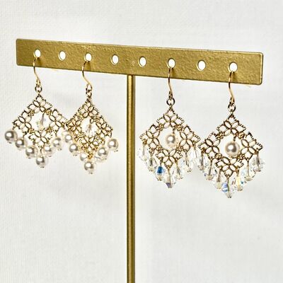 スカシスクエアモチーフのパールとクリスタルピアス/イヤリング