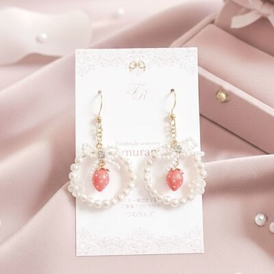 【金属アレルギー対応】大人可愛い苺とリボンの揺れるフープピアス/イヤリング|クリスマスギフト|いちご|リボン|揺れる|可愛い|パール|サージカルステンレス|